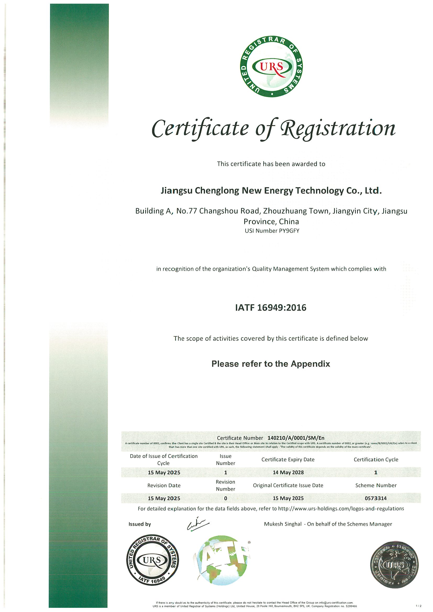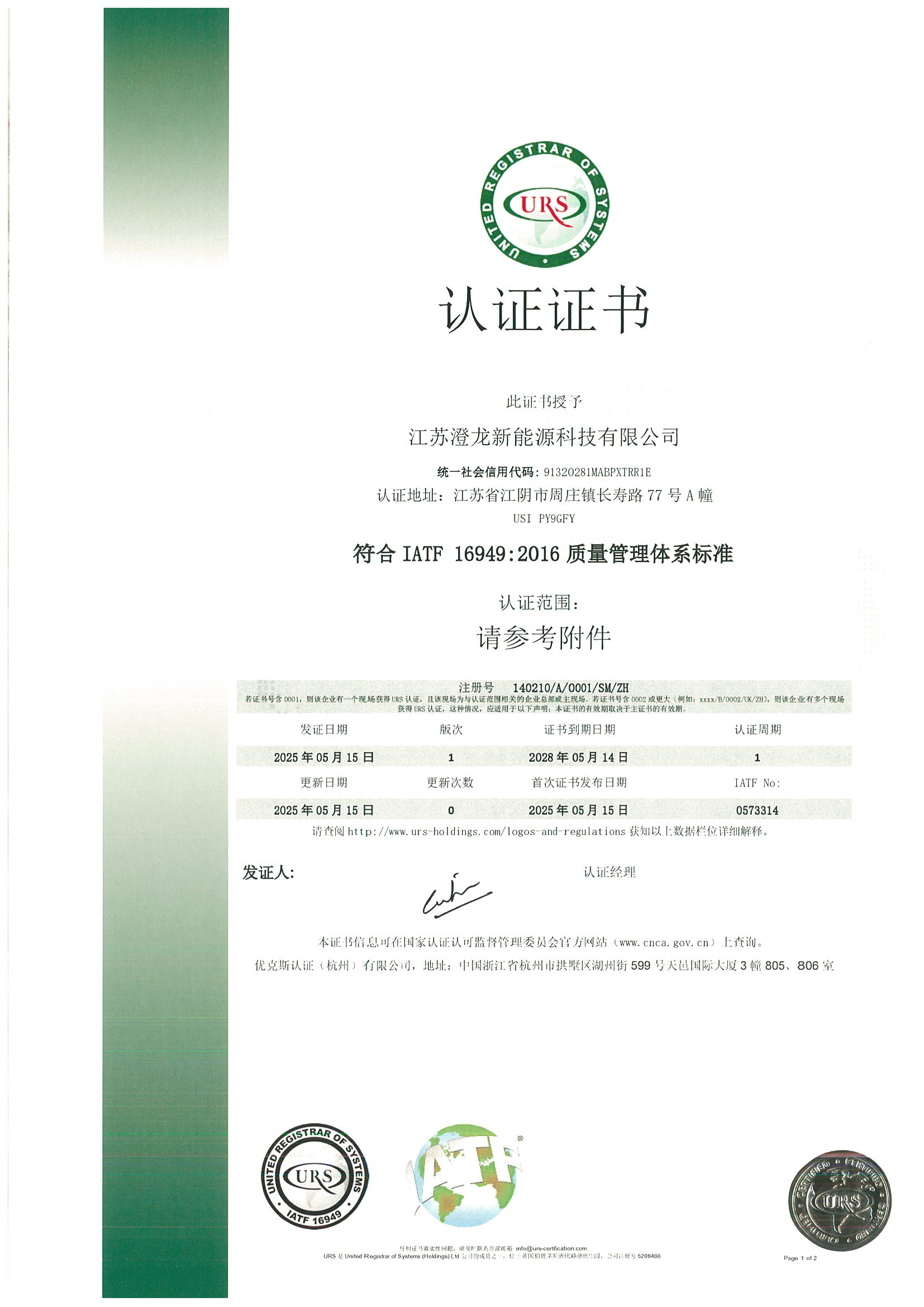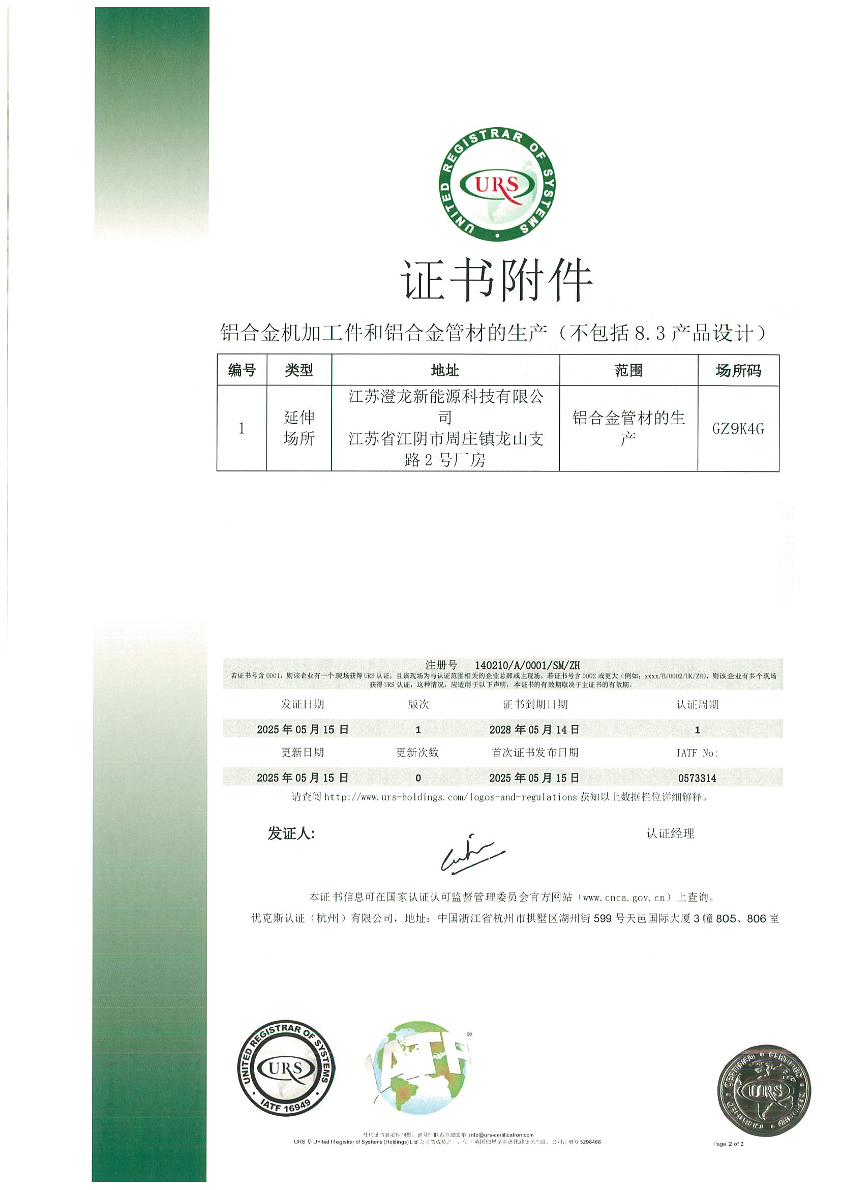 我们始终以严苛标准保障产品品质,江苏澄龙新能源科技有限公司已通过 IATF 16949:2016 质量管理体系认证,认证范围覆盖铝合金机加工件与铝合金管材的生产(不含 8.3 产品设计)。