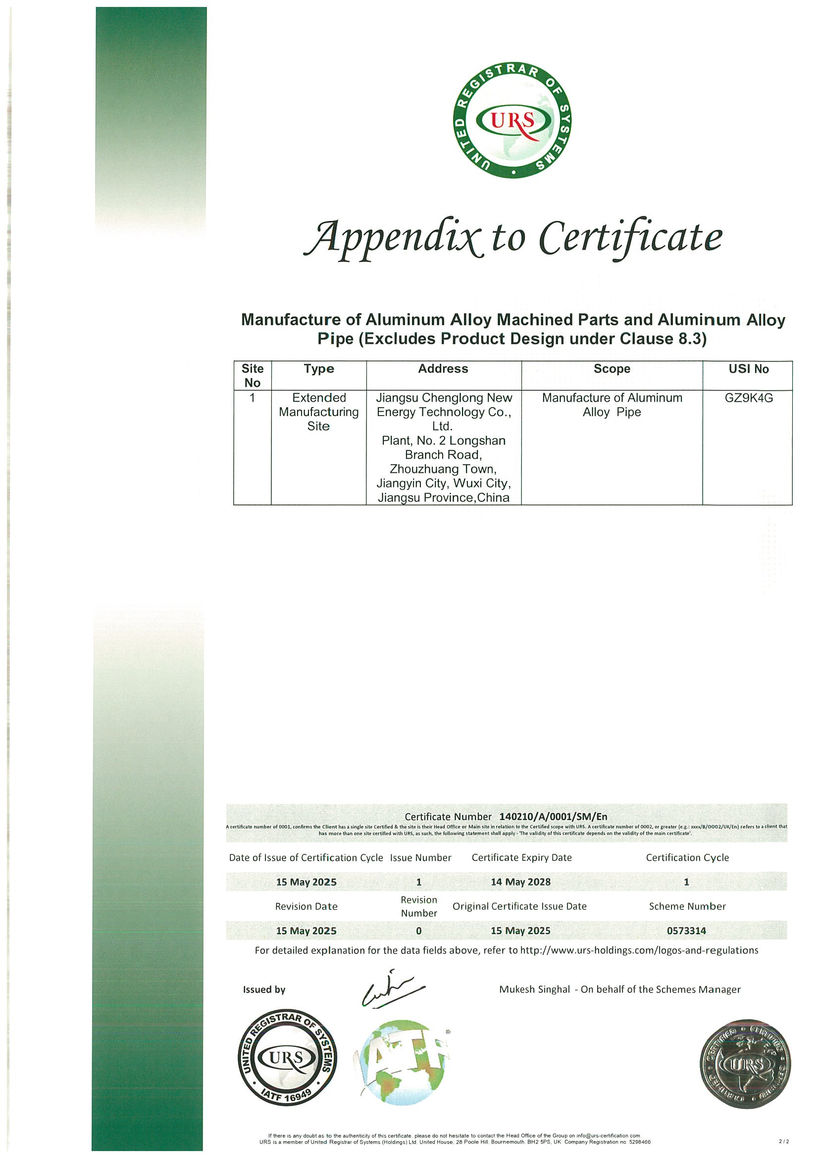 我们始终以严苛标准保障产品品质,江苏澄龙新能源科技有限公司已通过 IATF 16949:2016 质量管理体系认证,认证范围覆盖铝合金机加工件与铝合金管材的生产(不含 8.3 产品设计)。